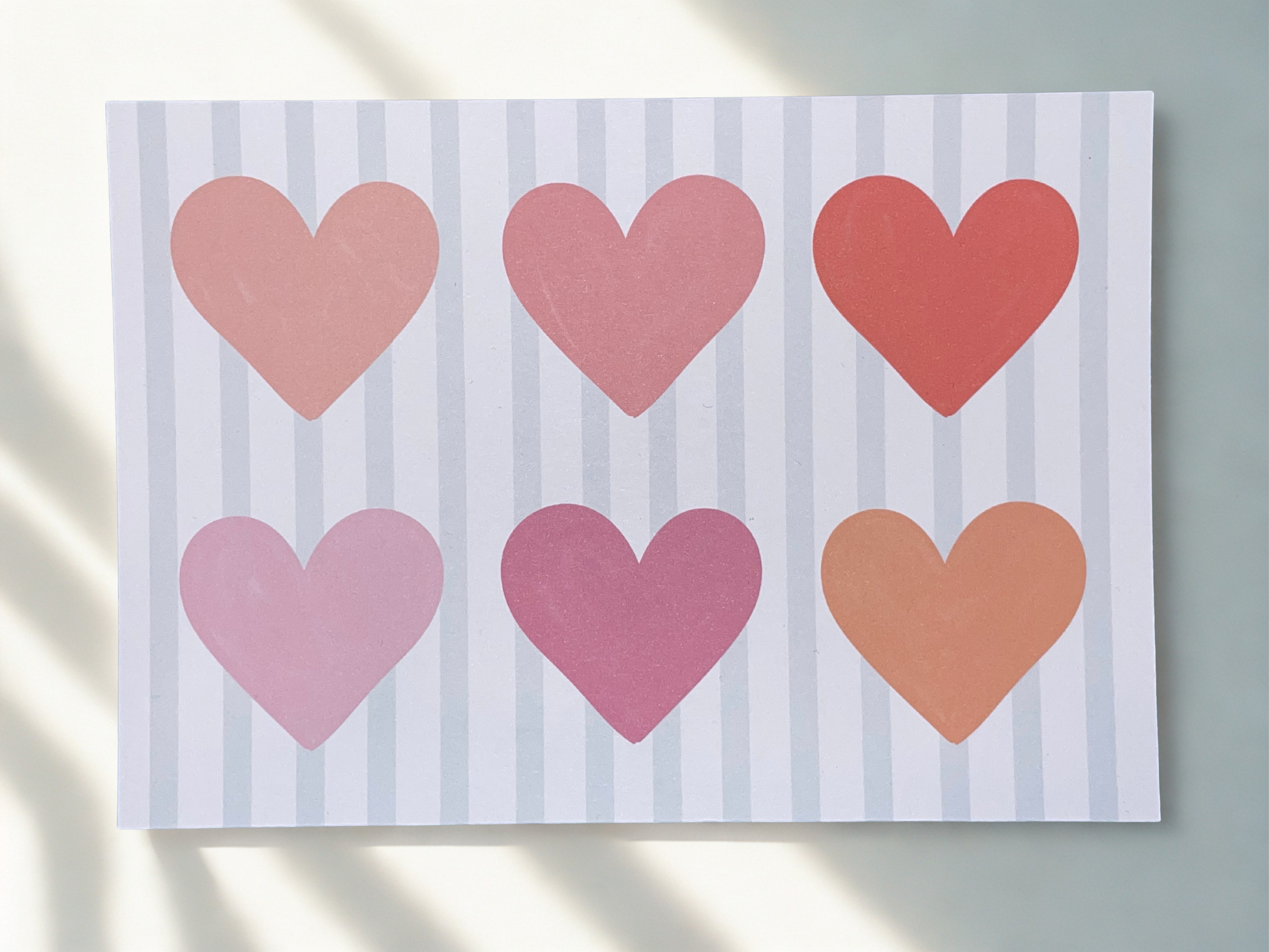 Schick Deinen Liebsten ein paar Herzen! Hier in verschiedenen rosa/pfirsich Tönen. Auf 350 gsm starkem Papier lokal gedruckt.